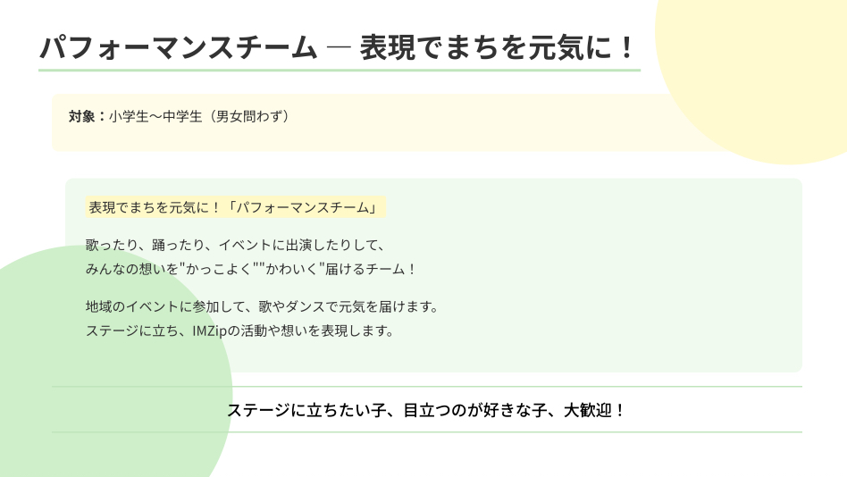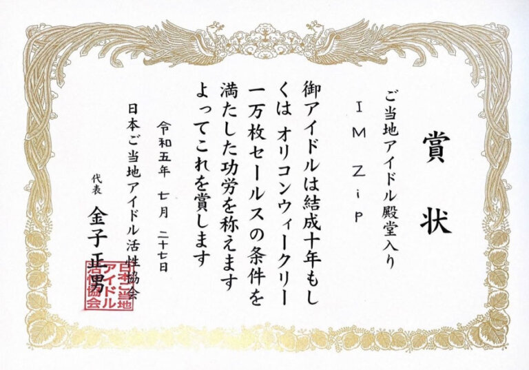 日本ご当地アイドル活性協会が認定する「ご当地アイドル殿堂入り」を果たしました! 2023年7月27日 IM Zipは、2023年7月27日に結成10年の基準を満たしたため、 全国106組目として、日本ご当地アイドル活性協会が認定する「ご当地アイドル殿堂入り」を果たしました!