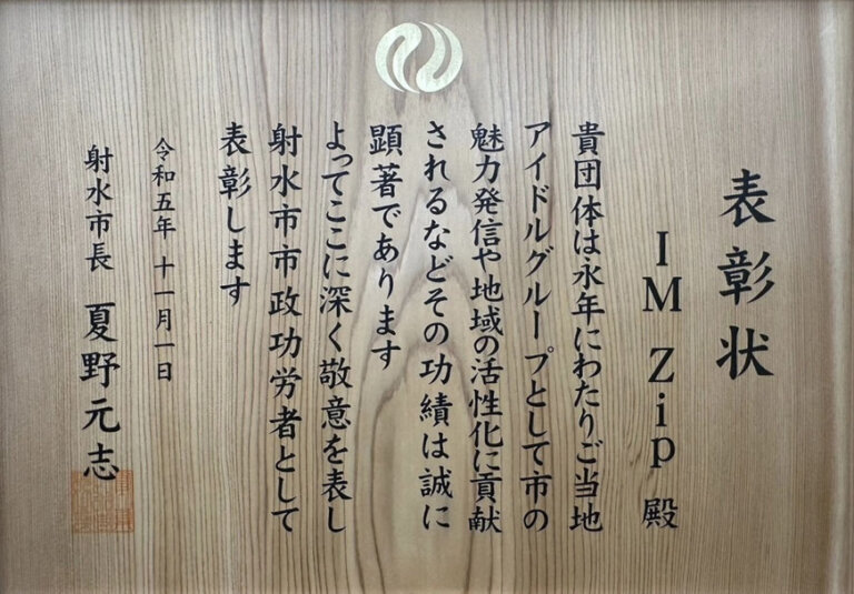 射水市市政功労者として表彰されました! 2023年11月1日 IM Zipは、永年にわたりご当地アイドルグループとして市の魅力発信や地域の活性化に貢献してきた功績が認められ、 2023年11月1日に、射水市市政功労者として表彰されました!